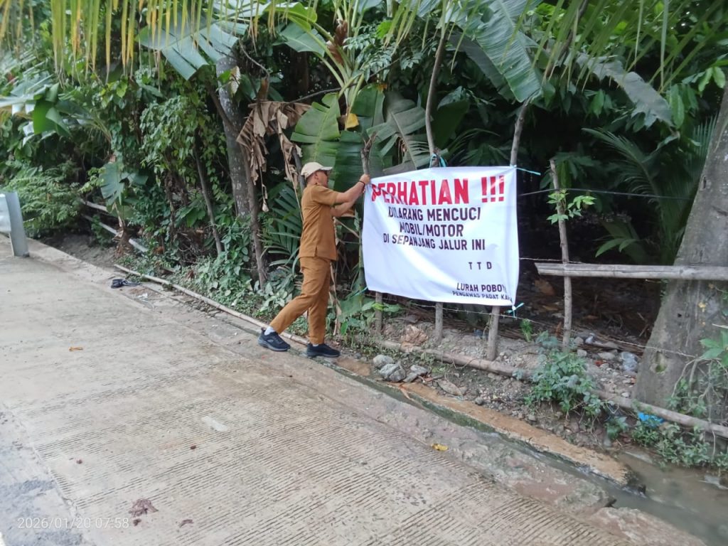 Lurah Poboya bapak MUHAMAD ZULFIN, S.AP. turun langsung dilapangan dan memasang spanduk “Pengumuman untuk tidak mencuci Mobil dan Motor disepanjang Jalan Pantosu Kelurahan Poboya” guna untuk mencegah kerusakan jalan. Palu, 20 Januari 2026.